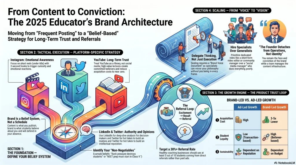 The education category has one unique advantage over most consumer categories: students make high-stakes decisions. A parent choosing between two JEE coaching institutes is not making an impulse purchase. They are making a ₹1–2 lakh decision that they will think about for weeks. In that kind of decision environment, trust is the currency—and trust is built by belief systems, not by frequent posting.